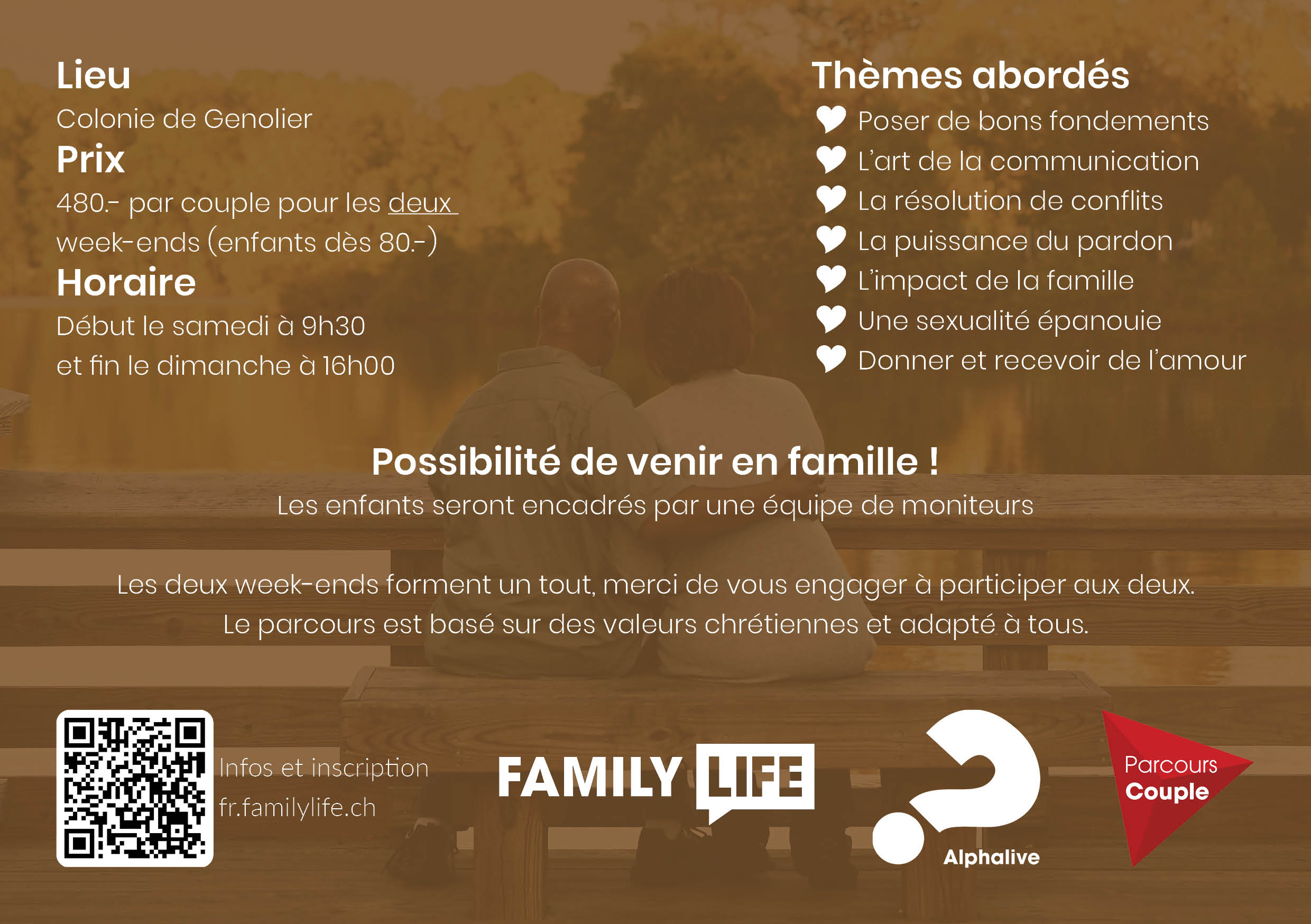 Sur deux week-ends, vous aurez la possibilité de suivre les thèmes du parcours Couple. Vous partagerez des repas à deux en tête-à-tête et des moments de détente en amoureux. Si vous le souhaitez, vous pouvez venir avec vos enfants.